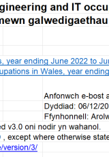 Cyflogaeth a chyfartaledd oriau a weithiwyd mewn galwedigaethau Peirianneg a TchG yng Nghymru, blwyddyn yn gorffen Mehefin 2022 i Fehefin 2024 , Saesneg yn unig, math o ffeil: ODS, maint ffeil: 7 KB