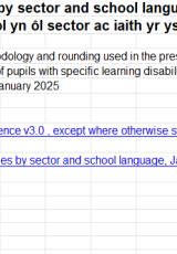 Disgyblion ag anableddau dysgu penodol yn ôl sector ac iaith yr ysgol, Ionawr 2025 , Saesneg yn unig, math o ffeil: ODS, maint ffeil: 5 KB