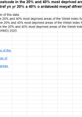 Canran y disgyblion ysgolion cynradd, canol ac uwchradd sydd â chod post cartref yn yr 20% a 40% o ardaloedd mwyaf difreintiedig Mynegai Amddifadedd Lluosog Cymru (MALlC) 2025, ym mis Ionawr 2025 , Saesneg yn unig, math o ffeil: ODS, maint ffeil: 123 KB
