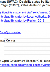 Cyfrifiad Blynyddol o'r Gweithlu Ysgol, statws anabledd yn ôl rôl staff, 2019 , Saesneg yn unig, math o ffeil: ODS, maint ffeil: 21 KB