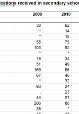 Ceisiadau a dderbyniwyd mewn ysgolion uwchradd yn ôl pwnc a rhanbarth, 2009 i 2019 , Saesneg yn unig, math o ffeil: ODS, maint ffeil: 23 KB