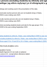 - Lefel a chyfradd pobl economaidd anweithgar (ag eithrio myfyrwyr) yn ôl ethnigrwydd a grŵp oedran, Cymru, blwyddyn sy’n bennu ym mis Mawrth 2006 i’r flwyddyn sy’n bennu ym mis Medi 2025