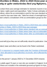 Ystadegau ynghylch twristiaeth ddomestig ar gyfer awdurdodau lleol yng Nghymru, cyfartaleddau tair blynedd o 2022 hyd 2024 , Saesneg yn unig, math o ffeil: ODS, maint ffeil: 17 KB