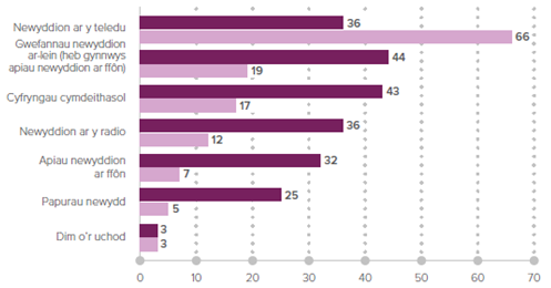 Newyddion ar y teledu yw’r brif ffynhonnell newyddion a gwybodaeth fel rheol i bobl yng Nghymru, gyda gwefannau newyddion ar-lein a’r cyfryngau cymdeithasol yn dilyn; mae gwahaniaethau amlwg fesul grŵp oedran.