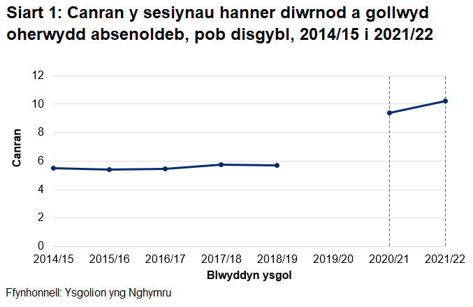 Nodwch os gwelwch yn dda nad oes modd cymharu’r data a gyhoeddir yn y datganiad hwn â’r data a gyhoeddir bob wythnos yn ystod y pandemig. Er mwyn bod mor gyson â phosibl â diffiniadau hanesyddol, nid oes gan godau '[' ac 'Y' yr un ystyr ystadegol yn y datganiad hwn ag a oedd ganddynt ym mhob datganiad presenoldeb a gyhoeddwyd yn 2020/21 a 2021/22 (gweler isod).