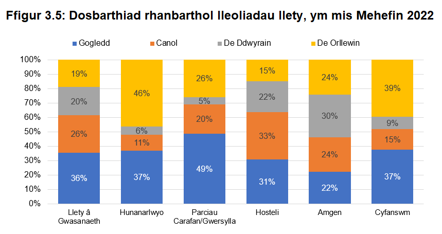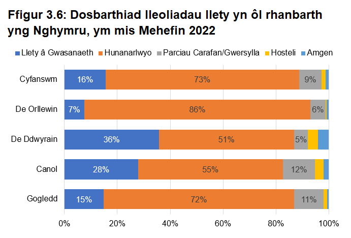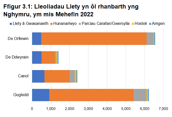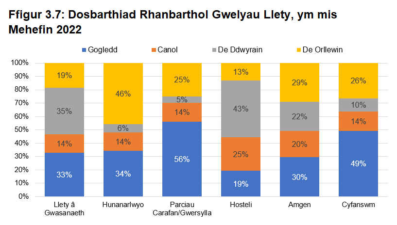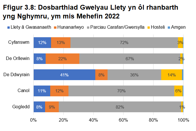 Gyda'i gilydd, mae De-orllewin Cymru, sydd â 6,557, a Gogledd Cymru, sydd â 6,038, yn cyfrif am dri chwarter y lleoliadau llety ond mae'r dosbarthiad yn amrywio yn ôl categori. Mae lleoliadau amgen wedi'u dosbarthu'n eithaf cyfartal rhwng y rhanbarthau, er y dylid nodi maint bach y bôn (195).