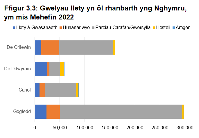 De-orllewin Cymru sydd â'r gyfran fwyaf ond un (26%), gyda 160,245 o welyau. Mae 2 o bob 3 (107,997) mewn lleoliadau carafannau a gwersylla ond mae mwy nag un o bob pump, sef 35,914, mewn lleoliadau hunanddarpar.