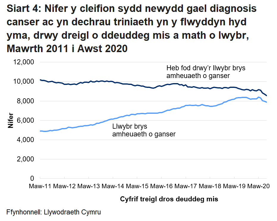 Yn ystod y 12 mis hyd at fis Awst 2020, dechreuodd 8,380 o gleifion a oedd newydd gael diagnosis canser a hynny drwy’r llwybr heb fod ar frys oherwydd amheuaeth o ganser. Mae hyn yn ostyngiad o 8.3% (761 o gleifion) ers y 12 mis blaenorol (y flwyddyn ddaeth i ben ym mis Awst 2019) ac yn ostyngiad o 11.0% (1,032 o gleifion) o'r cyfnod cyfatebol 5 mlynedd yn ôl (y flwyddyn ddaeth i ben ym mis Awst 2015).