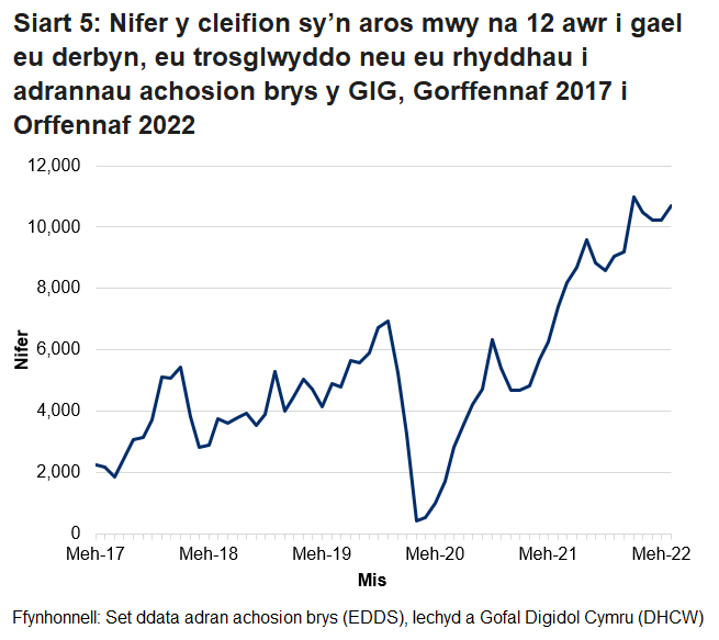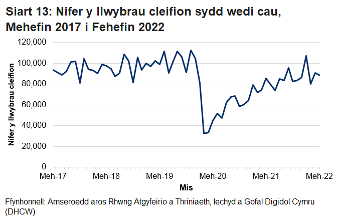 Sylwer: Diwygiwyd y data i gynnwys llwybrau caeedig bwrdd iechyd Cwm Taf Morgannwg erbyn hyn. Hyd at ddatganiad ystadegol Gorffennaf 2022, nid oedd y gyfres ddata ar gael ar gyfer Cwm Taf Morgannwg. Mae rhagor o fanylion ar gael yn yr adran gwybodaeth allweddol am ansawdd.