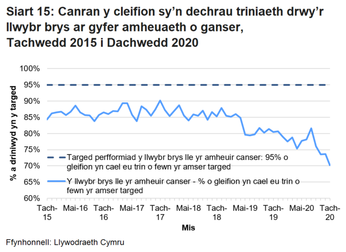 Llwybr brys gydag amheuaeth o ganser: Ni ddylai 95% o gleifion aros mwy na 62 diwrnod am driniaeth. Mae cleifion sydd ar y llwybr hwn wedi cael eu cyfeirio ar ôl cael gwybod yr amheuir bod canser arnynt ee gan feddyg teulu.