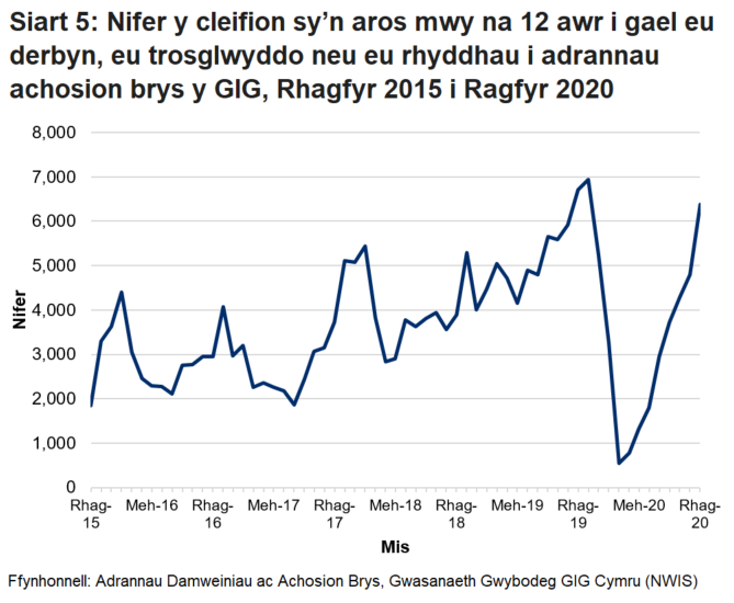 Yn ystod misoedd cynnar pandemig COVID-19, cafwyd gostyngiad sylweddol yn y nifer a oedd yn aros dros 12 awr. Ym mis Ebrill 2020, roedd 547 o gleifion wedi gorfod aros am fwy na 12 awr, y nifer isaf ers 2013. Ers y pwynt isaf hwnnw, mae’r nifer sy’n aros mwy na 12 awr wedi codi bob mis ond mae wedi bod yn is na’r misoedd cyfatebol yn 2019.