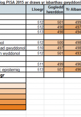- Mae sgôr cymedrig 29 gwlad o leiaf 10 pwynt o flaen Cymru ar gyfer gwyddoniaeth, ac mae sgôr cymedrig 31 gwlad ar gyfer gwyddoniaeth o leiaf 10 pwynt yn is.