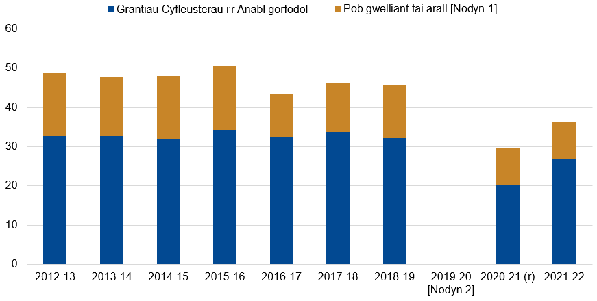 [Nodyn 2] Ni chasglwyd data ar gyfer 2019-20 oherwydd effaith pandemig y Coronafeirws (COVID-19).
