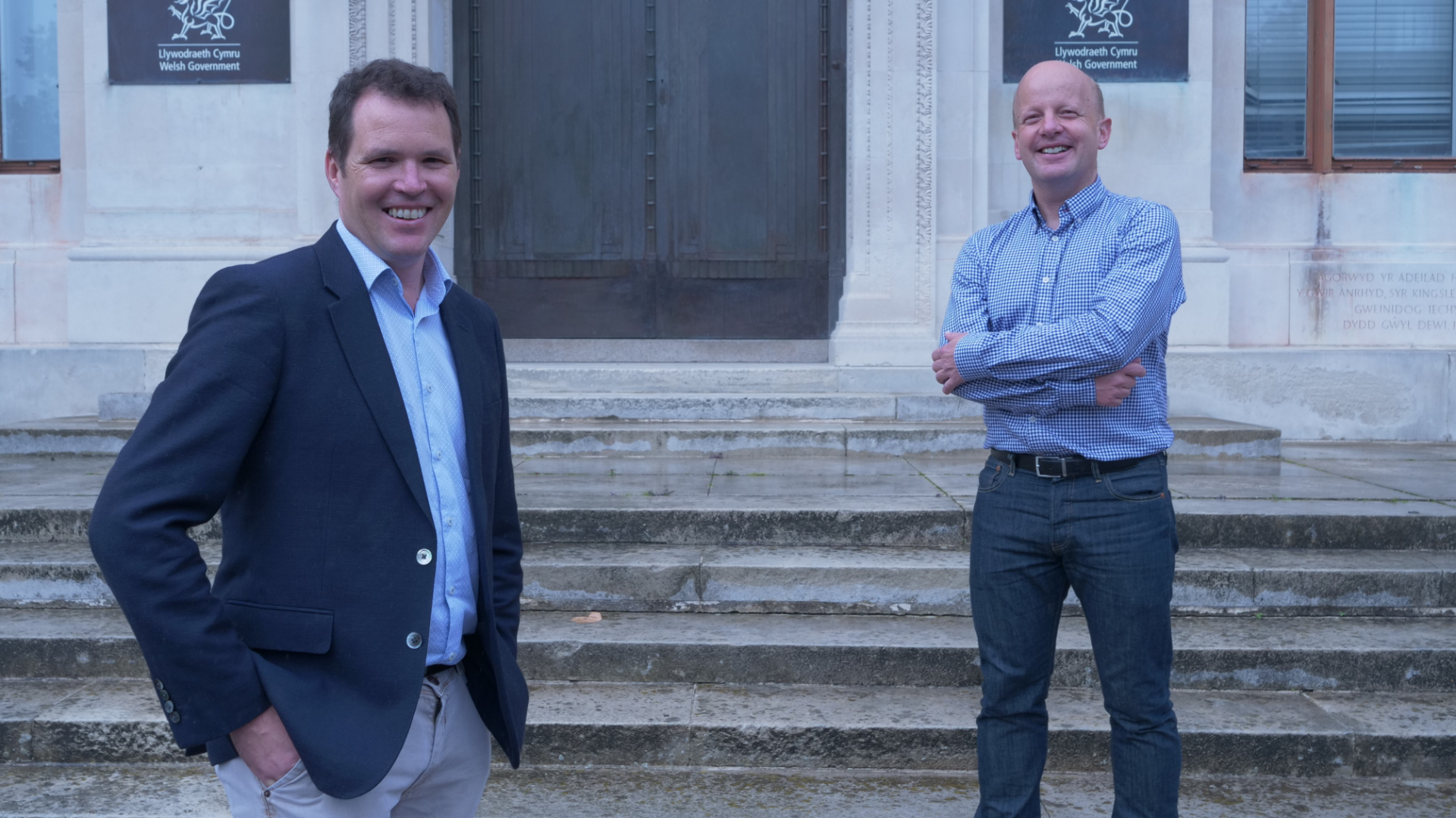 Lee Walters, Dirprwy Weinidog yr Economi a Thrafnidiaeth a Dr Dafydd Trystan Davies, Cadeirydd newydd Bwrdd Teithio Llesol.