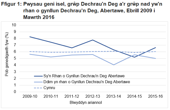 At ei gilydd, mae Ffigurau 1 a 2 yn dangos yr hyn sy'n ymddangos yn duedd ar i lawr ar gyfer grŵp Dechrau'n Deg a'r grŵp nad yw'n rhan o gynllun Dechrau'n Deg, h.y. mewn perthynas â phwysau geni isel a genedigaethau ymhlith mamau yn eu harddegau. Fodd bynnag, efallai yn achos pwysau geni isel ac yn sicr ar gyfer genedigaethau ymhlith mamau yn eu harddegau, mae'r gostyngiad rhwng 2009-10 a 2015-16 yn ymddangos yn fwy yn y grŵp Dechrau'n Deg nac yn y grŵp nad yw'n rhan o gynllun Dechrau'n Deg. Gall hyn ddarparu dangosydd rhagarweiniol cyfyngedig o effaith bosibl Dechrau'n Deg ar bwysau geni isel a genedigaethau ymhlith mamau yn eu harddegau. Byddai angen gwaith pellach i ganolbwyntio ar enedigaethau ymhlith mamau sydd eisoes yn derbyn gwasanaethau Dechrau'n Deg yn unig er mwyn cadarnhau'r cysylltiad â gwasanaethau Dechrau'n Deg. Bydd adroddiadau yn y dyfodol yn ceisio gwahanu'r ddau grŵp hyn i archwilio'r mater ymhellach. Dim ond unwaith y bydd data ar gael ar gyfer mwy nag un awdurdod lleol y bydd y gwaith hwn yn bosibl, oherwydd mae'n debygol y bydd y niferoedd yn rhy fach ar gyfer Abertawe.