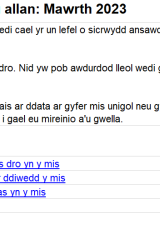 [4] Cyn mis Mawrth 2023 roedd un awdurdod lleol wedi adrodd am aelwydydd, nid unigolion. Gellir priodoli rhan o'r cynnydd o fis Chwefror 2023 i fis Mawrth 2023 i hyn.