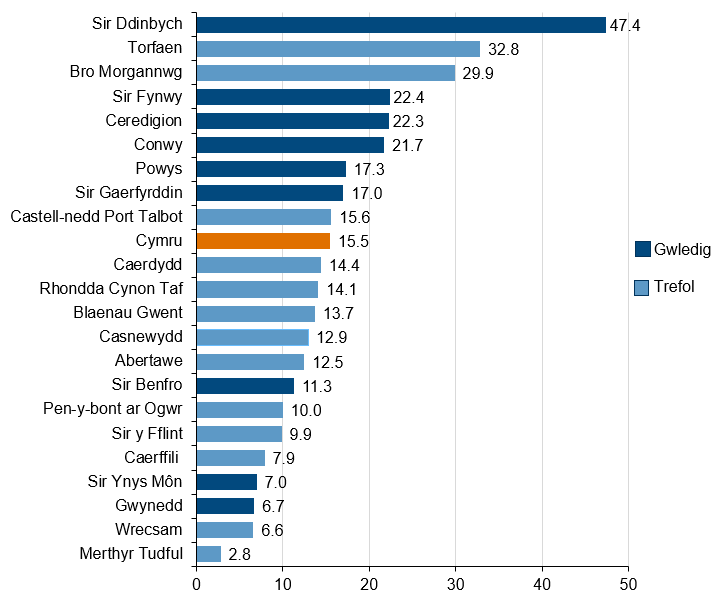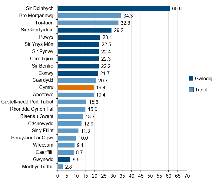 Graff bar yn dangos cyfradd yr unedau tai ychwanegol a ddarparwyd fesul 10,000 o aelwydydd yng Nghymru, yn ôl ardal awdurdod lleol. Mae'r graff wedi'i rannu'n ardaloedd trefol a gwledig ac mae'n dangos bod gan y mwyafrif o'r ardaloedd gwledig gyfradd uwch fesul 10,000 o aelwydydd o gymharu â'r ardaloedd trefol.