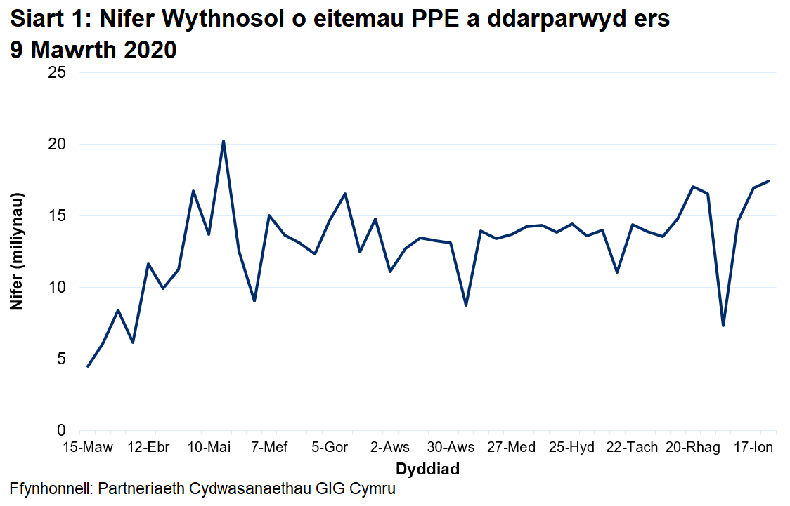 Mae’r nifer wythnosol o eitemau PPE a ddarparwyd wedi cynyddu’n gyffredinol ers mis Mawrth 2020 gan gyrraedd uchafbwynt o 20.2 miliwn ym mis Mai 2020. Ers hynny, mae nifer yr eitemau a ddarparwyd bob wythnos wedi amrywio ond at ei gilydd mae wedi aros o gwmpas 14 miliwn.