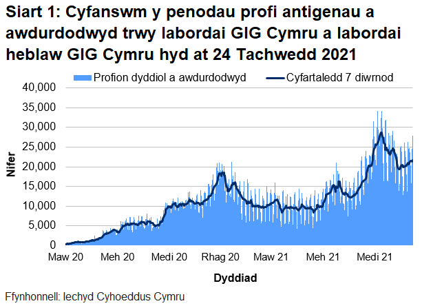 Mae Siart 1 yn dangos nifer y cyfnodau profion a awdurdodwyd yn labordai GIG Cymru ac mewn labordai heblaw rhai GIG Cymru. Mae’r ffigurau hyn yn cynnwys profion a broseswyd drwy labordai y tu allan i GIG Cymru, sy’n cynnwys samplau preswylwyr o Gymru a gymerwyd mewn canolfannau profi yn Lloegr, canolfannau profi yng Nghymru, profion a archebir trwy’r porth sefydliadau a phecynnau profi gartref.