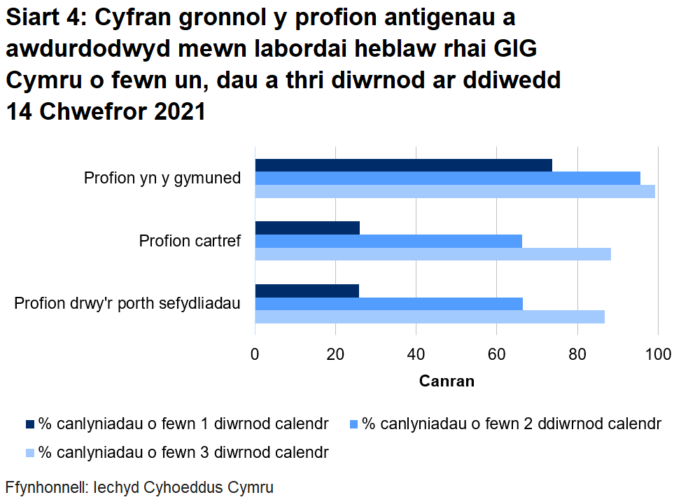 Yn gyffredinol, roedd nifer y profion a ddychwelwyd o fewn un diwrnod calendr ar gyfer profion mewn ysbyty a phrofion yn y gymuned yn gymharol sefydlog yn y tymor hir. Ers dechrau mis Hydref 2020, bu cynnydd cyffredinol yn nifer y profion asymptomatig a ddychwelwyd o labordai ategol o fewn un diwrnod calendr. Cafodd yr amseroedd dychwelyd eu heffeithio gan y gwaith cynnal a chadw a drefnwyd ymlaen llaw ar system Rheoli Gwybodaeth Labordai Cymru (WLIMS) yn yr wythnos a oedd yn dechrau ar 7 Rhagfyr 2020.