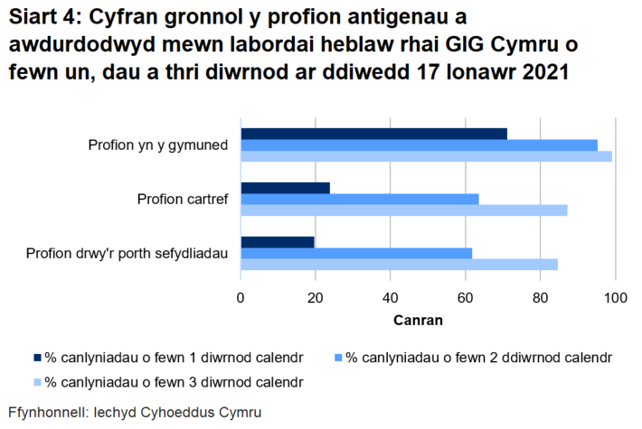Ers i'r profion ddechrau hyd at ddiwedd 17 Ionawr 2021, mae 20,274 o brofion gwrthgyrff wedi’u cynnal ar weithwyr allweddol neu breswylwyr mewn sefydliad addysgol a 48,294 o brofion gwrthgyrff wedi’u cynnal ar weithwyr allweddol gofal iechyd. Mae hyn yn adlewyrchu'r strategaeth samplu bresennol o flaenoriaethu profion gwrthgyrff ar gyfer y gweithwyr allweddol a'r preswylwyr hyn. Mae'r data hyn yn cynnwys 13,247 o brofion llif unffordd.