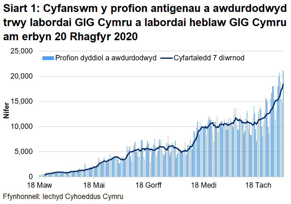 Yn ystod nos Wener 11 Rhagfyr, cynhaliwyd gwaith cynnal a chadw wedi’i gynllunio ymlaen llaw ar System Rheoli Gwybodaeth Labordai Cymru (WLIMS) er mwyn caniatáu i ddiweddariadau hanfodol i wasanaeth gael eu gwneud. Ar ôl yr amser segur hwn, cafwyd cyfnod o gysoni a dilysu data sy'n cael ei adlewyrchu yn y ffigurau yn y cyhoeddiad hwn. Efallai y bydd rhai newidiadau bach o hyd yn y niferoedd a gofnodwyd ar gyfer y dyddiadau hyn mewn cyhoeddiadau yn y dyfodol.