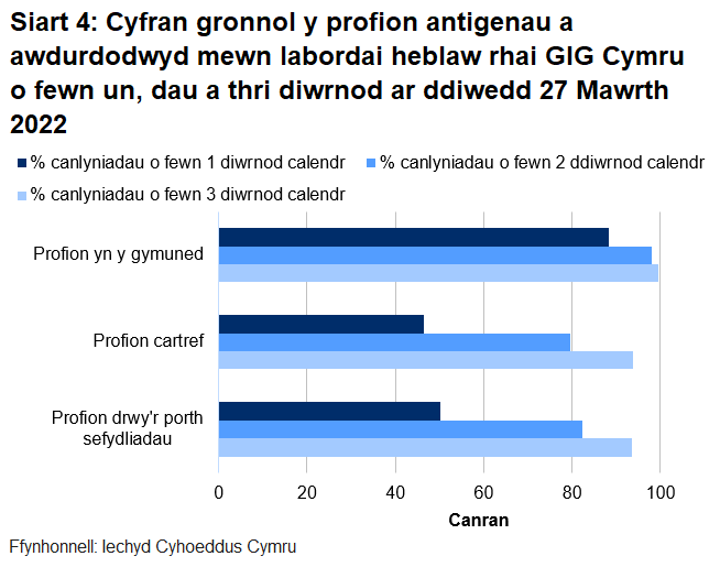 - Roedd y capasiti i gynnal profion antigenau yn labordai GIG Cymru yn 15,167 ar 27 Mawrth 2022. Nid yw hyn yn cynnwys y capasiti profi yn labordai’r DU lle mae samplau rhai o drigolion Cymru yn cael eu prosesu.