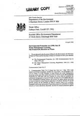Deddf Diogelu'r Amgylchedd 1990, Rheoliadau Trwyddedu Rheoli Gwastraff 1994 a'r Gyfarwyddeb Fframwaith Gwastraff (cylchlythyr 26/94) , Saesneg yn unig, math o ffeil: PDF, maint ffeil: 7 MB