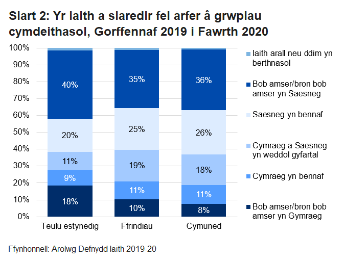 Roedd patrymau tebyg i'w gweld wrth edrych ar ddefnydd o’r Gymraeg, gyda 51% o siaradwyr Cymraeg yng ngogledd orllewin Cymru yn siarad Cymraeg yn bennaf neu bob amser â’u teulu estynedig. Dywedodd 44% eu bod yn gwneud hynny â’u ffrindiau, a 46% eu bod yn gwneud hynny â phobl yn eu cymuned leol. I siaradwyr Cymraeg yn y de ddwyrain, roedd 8% yn siarad Cymraeg yn bennaf neu bob amser â’u teulu estynedig. Dywedodd 5% eu bod yn gwneud hynny â’u ffrindiau, a nifer fechan dweud eu bod yn gwneud hynny â phobl yn eu cymuned leol.
