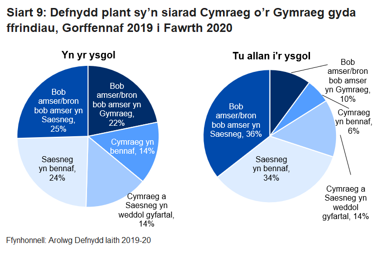 Gofynnwyd i blant pa iaith maen nhw'n siarad â'u ffrindiau yn yr ysgol a’r tu allan i'r ysgol. Roedd yr ymatebwyr yn llawer fwy tebygol o siarad Cymraeg â'u ffrindiau yn yr ysgol nag y tu allan i’r ysgol. Roedd dros draean o blant a phobl ifanc a oedd yn siarad Cymraeg yn defnyddio'r Gymraeg yn bennaf neu bob amser wrth siarad â ffrindiau yn yr ysgol, o'u cymharu ag 16% y tu allan i'r ysgol. Wrth gymharu defnydd plant a phobl ifanc sy'n siarad Cymraeg y tu allan i'r ysgol â defnydd oedolion sy'n siarad Cymraeg y tu allan i’r gwaith, roedd oedolion sy’n siarad Cymraeg yn fwy tebygol o siarad Cymraeg â'u ffrindiau.