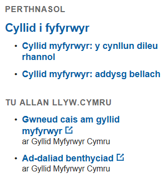 Dolenni cysylltiedig mewn bar ochr gan gynnwys dolenni at LLYW.CYMRU a gwefannau eraill