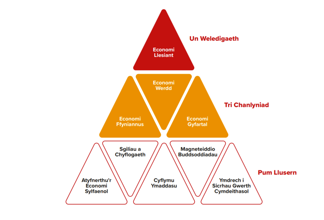 Ein gweledigaeth yw economi llesiant sy'n ysgogi ffyniant, sy'n amgylcheddol gadarn, ac sy’n helpu pawb i wireddu eu potensial. Mae wedi'i gwreiddio yn ein cynllun gweithredu ar yr economi presennol, Ffyniant i Bawb, gyda'i ddibenion cynyddol o leihau anghydraddoldeb a rhannu cyfoeth a llesiant ledled Cymru. Heb os mae ein llesiant economaidd ynghlwm wrth ein llesiant amgylcheddol, diwylliannol a chymdeithasol.