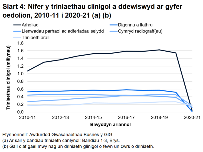 Mae Siart 4 yn dangos nifer y triniaethau clinigol ar gyfer oedolion yn ôl y math o driniaeth a’r flwyddyn ers 2010-11, am y pum prif driniaeth glinigol cyn y pandemig.