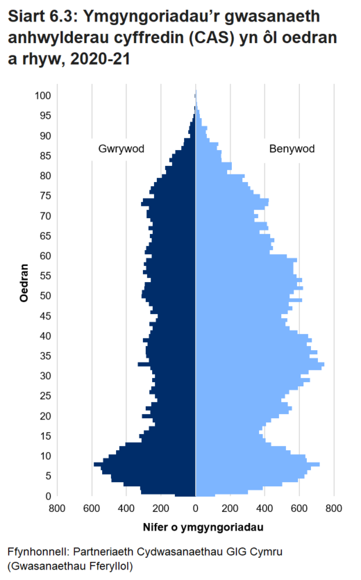 Roedd mwy nag 1 o bob 5 (22%) o ymgyngoriadau CAS yn ymwneud â phlant o dan 16 oed. Roedd bron i ddau draean (63%) o’r holl ymgyngoriadau yn ymwneud â benywod.