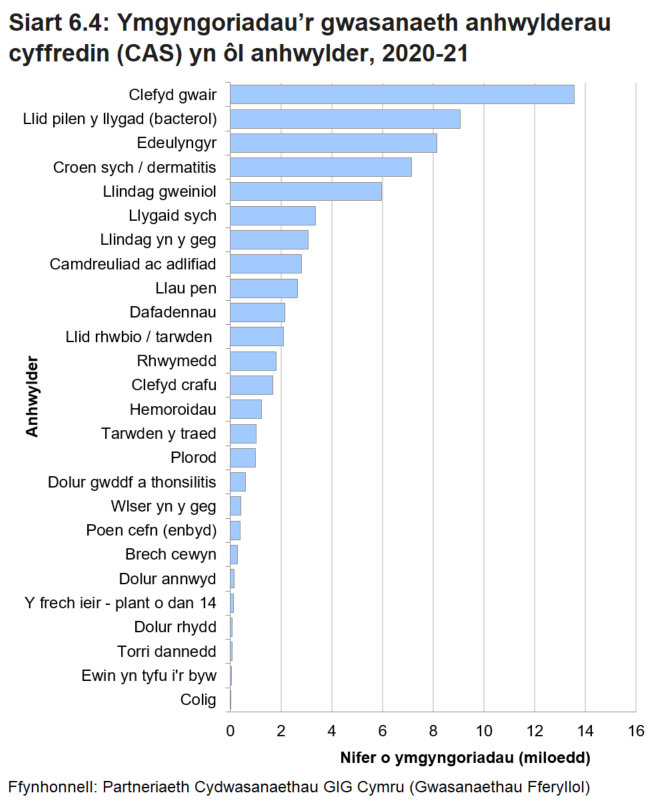 Defnyddiodd 2,109 o bobl y gwasanaeth anhwylderau cyffredin fwy na dwywaith yn ystod 2020-21; defnyddiodd un person y gwasanaeth 13 o weithiau, a defnyddiodd 5 o bobl y gwasanaeth fwy na 10 o weithiau.
