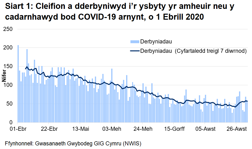 Mae ffigurau ar dderbyniadau, cyfnodau yn yr ysbyty a defnydd gwelyau yn cynnwys data o ysbytai acíwt o 1 Ebrill 2020 ymlaen, ysbytai maes o 20 Ebrill 2020 ymlaen, ysbytai cymunedol o 23 Ebrill 2020 ymlaen ac unedau iechyd meddwl o 10 Gorffennaf 2020 ymlaen. Cafodd data o unedau iechyd meddwl eu cynnwys yn ôl-weithredol o 10 Gorffennaf am y tro cyntaf yn natganiad 20 Awst 2020. Bydd unedau iechyd meddwl yn parhau i gael eu cynnwys er mwyn cael darlun mwy cynhwysfawr ar draws ysbytai. Bydd y ffigurau rhwng 10 Gorffennaf a 12 Awst yn debygol o fod yn wahanol i'r hyn a gyhoeddwyd yn flaenorol. Cafodd cynnwys gwelyau iechyd meddwl effaith fach ar ffigurau cleifion COVID-19 ond effaith fawr ar yr holl ffigurau ysbytai, gan nad yw’r rhan fwyaf o gleifion iechyd meddwl yn gleifion COVID-19