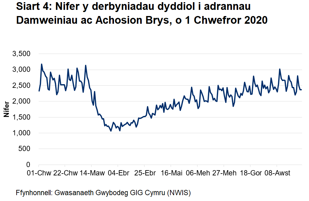 Gan gynnwys derbyniadau i ysbytai Mawr a Bach, drwy bob dull cludo, ar draws Cymru. Nid yw rhai unedau bach Damweiniau ac Argyfwng yn gallu cyflwyno data dyddiol, felly mae'n debyg bod tangyfrif bach yn y cyfanswm sy’n mynychu.