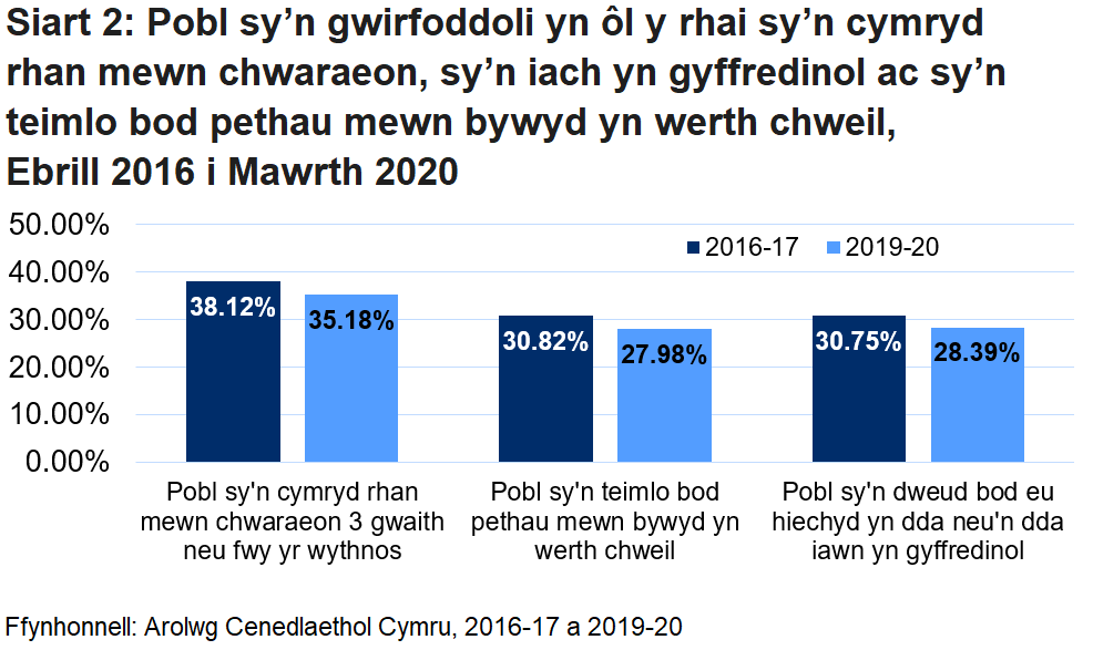 Roedd 26% o bobl a oedd yn teimlo bod pethau mewn bywyd yn werth chweil yn wirfoddolwyr o gymharu ag 11% o'r rhai nad oeddent yn teimlo i’r un graddau bod pethau mewn bywyd yn werth chweil. Yn yr un modd â statws iechyd, mae perthynas ddwy ffordd rhwng y ffactorau hyn: gall gwirfoddoli roi mwy o ymdeimlad i unigolyn bod pethau yn eu bywyd yn werth chweil tra gall person sy'n ystyried pethau'n werth chweil hefyd fod yn fwy tebygol o roi o’i amser i wirfoddoli. (Siart 2)