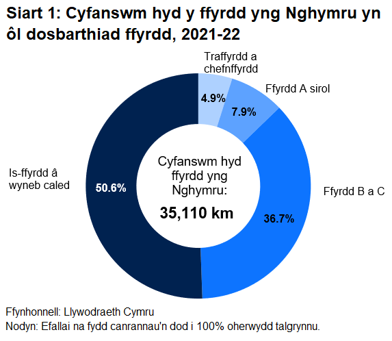 Cyfanswm hyd y ffordd yng Nghymru yn 2021-22 oedd tua 35,100 km, cynnydd o 0.3% o'r flwyddyn flaenorol (2020-21). Nid yw cyfanswm hyd ffyrdd yng Nghymru yn newid llawer o flwyddyn i flwyddyn. Mae peth o'r cynnydd blynyddol yn ganlyniad i welliant yn ansawdd y data yn hytrach na chynnydd gwirioneddol.
