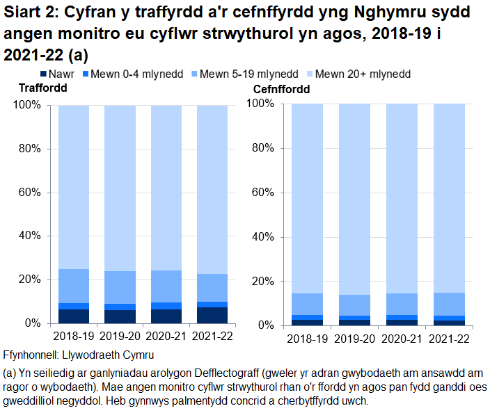 Yn 2021-22, roedd angen monitro cyflwr strwythurol 7.3% o'r rhwydwaith traffyrdd a 2.5% o'r rhwydwaith cefnffyrdd. Mae hyn yn cymharu â 6.4% a 2.9% yn y drefn honno yn 2020-21.
