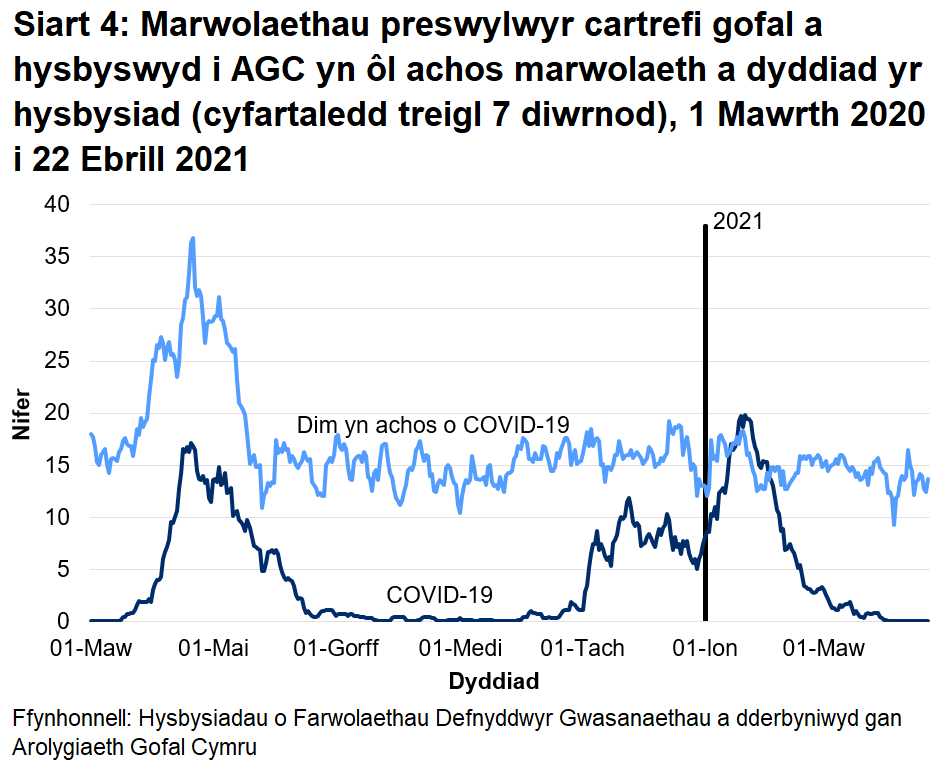 - Nid yw AGC wedi cael gwybod am unrhyw farwolaethau sy'n gysylltiedig â COVID-19 ers 26 Mawrth 2021. Mae hyn yn debyg i'r nifer a welwyd ddechrau mis Tachwedd 2020.