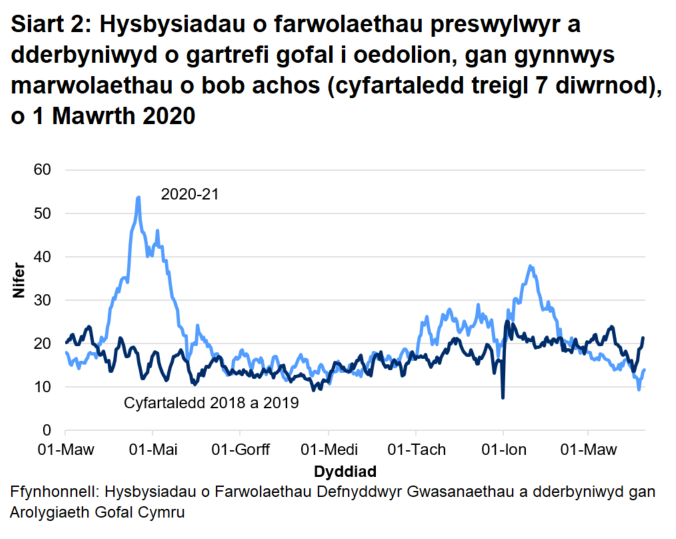 Mae’r marwolaethau sy’n gysylltiedig â COVID-19 yn y siart yn cynnwys achosion sydd wedi’u cadarnhau ac achosion posib o COVID-19. Ehangwyd y polisi profi cartrefi gofal ar 16 Mai i gynnwys cynnig profion i bob aelod o staff a phob preswyliwr sy’n symptomatig ac asymptomatig a nad ydynt erioed wedi profi'n bositif am COVID-19, hyd yn oed lle nad yw'r cartref wedi rhoi gwybod am achosion posibl neu wedi eu cadarnhau. Gallai profion mwy eang fod wedi arwain at rai marwolaethau'n cael eu cofnodi fel marwolaethau nad ydynt yn rhai COVID-19 pan fyddant o'r blaen efallai wedi cael eu cyhoeddi fel rhai a amheuir o farwolaeth COVID-19.