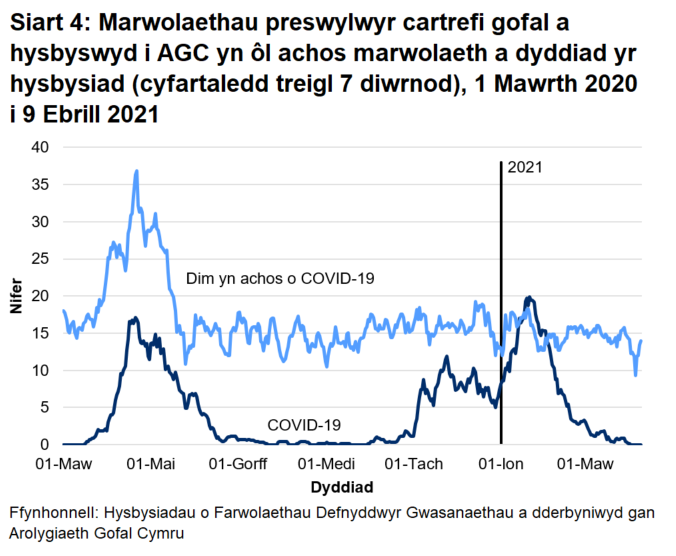 - Dros yr wythnosau diwethaf mae nifer y marwolaethau sy'n gysylltiedig â COVID-19 wedi bod yn gostwng, nid yw AGC wedi cael gwybod am unrhyw farwolaethau sy'n gysylltiedig â COVID-19 ers 26 Mawrth 2021. Mae hyn yn debyg i'r nifer a welwyd ddechrau mis Tachwedd 2020.