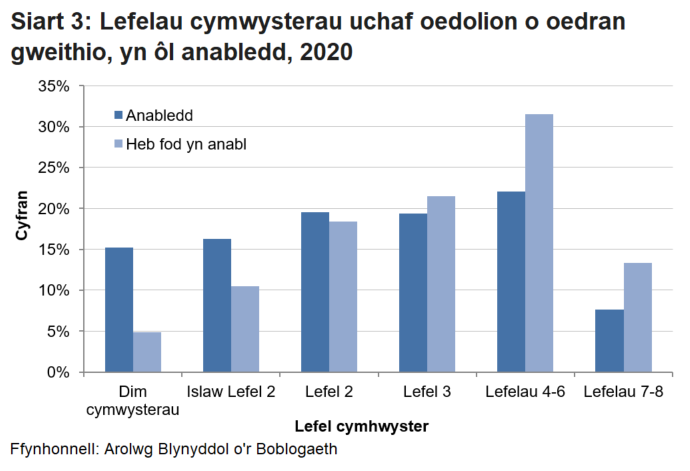 - Roedd gan 62.3% o oedolion o oedran gweithio yng Nghymru gymwysterau i drothwy lefel 3, o gymharu â 59.4% yn 2019.