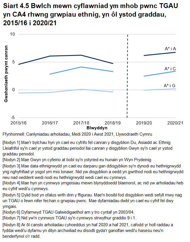 Yn 2020/21, ehanghodd y bwlch rhwng disgyblion nad ydynt yn gymwys i gael prydau ysgol am ddim a disgyblion sy’n gymwys i gael prydau ysgol am ddim sydd wedi cael graddau TGAU A* i A i 21.3 pwynt canran, o 17.8 pwynt canran yn 2019/20. Roedd y bwlch wedi bod yn gymharol sefydlog o’r blaen, sef tua 14.7 pwynt canran rhwng 2015/16 a 2018/19 cyn ehangu yn y 2 flynedd ddiwethaf.
