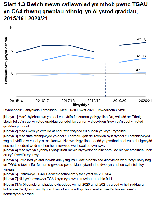 Yn 2020/21, ehangodd y bwlch rhwng disgyblion nad ydynt yn gymwys i gael prydau ysgol am ddim a disgyblion sy'n gymwys i dderbyn graddau TGAU A* i A i 21.3 pwynt canran, o 17.8 pwynt canran yn 2019/20. Cyn hynny roedd y bwlch wedi bod yn gymharol sefydlog ar tua 14.7 pwynt canran rhwng 2015/16 a 2018/19 cyn ehangu yn ystod y 2 flynedd ddiweddaraf.
