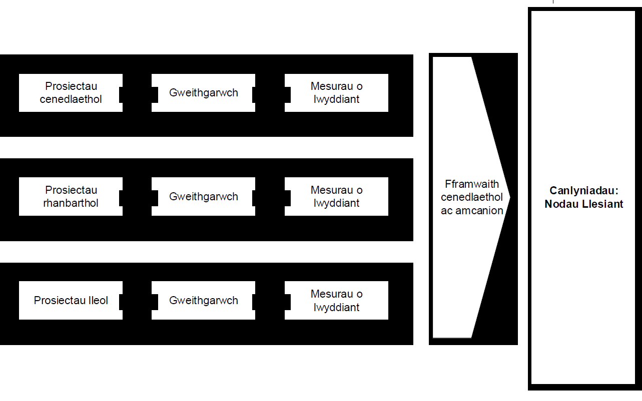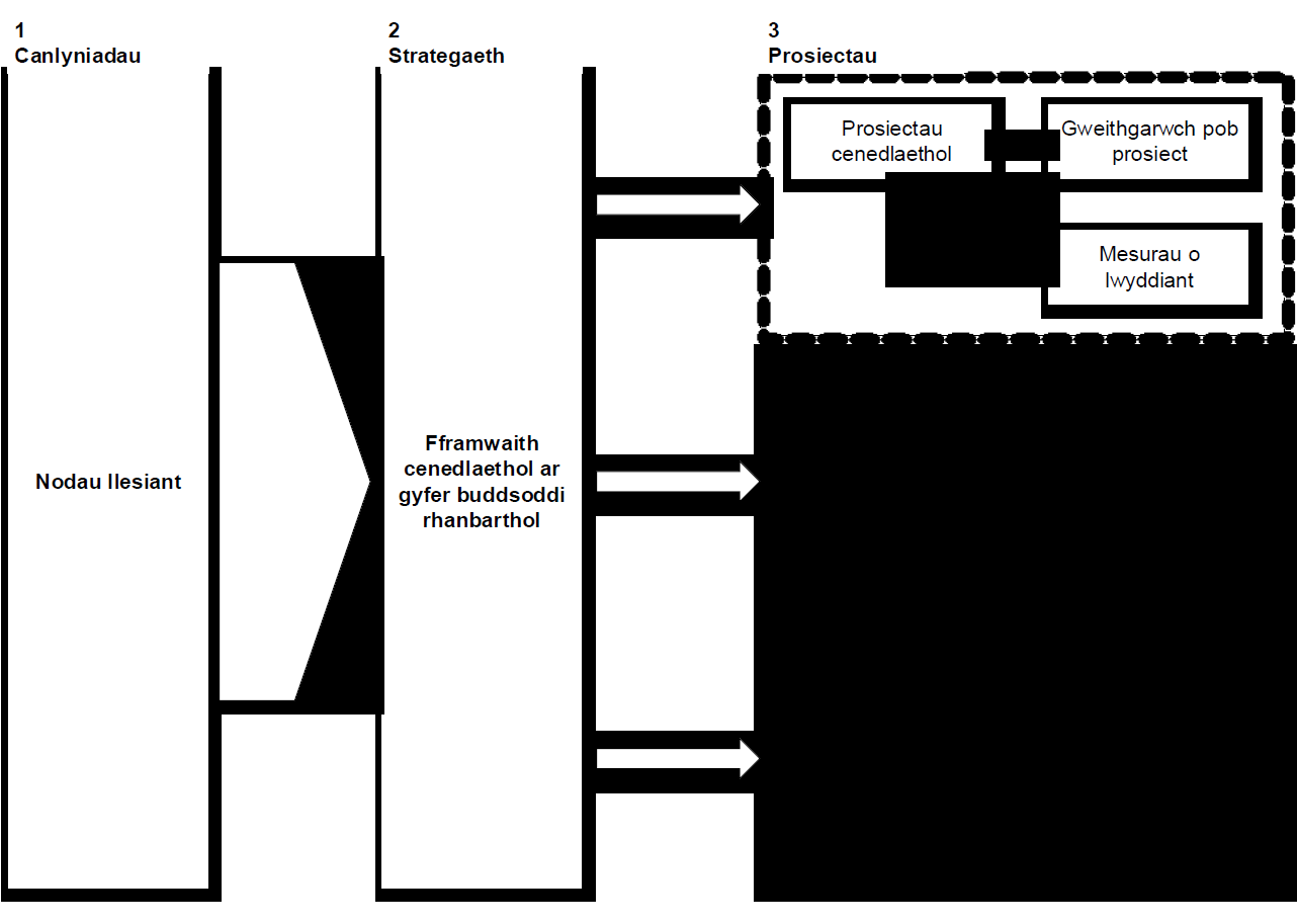 18. Os mai ‘pam rydym yn gwneud yr hyn rydym yn ei wneud’ yw ein canlyniadau; yna’r strategaeth yw ‘sut’ rydym yn mynd i’w wneud, a’r prosiect unigol yw ‘beth’ rydym yn mynd i’w wneud.