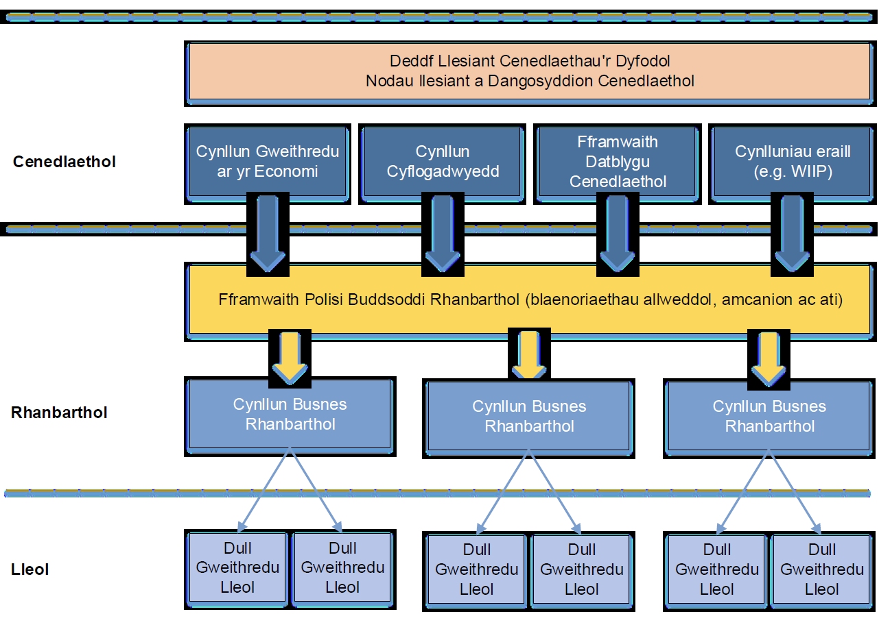 23. Bydd fframwaith rhanbarthol newydd yn helpu i lywio buddsoddiadau ar lefel genedlaethol, ranbarthol a lleol drwy flaenoriaethu amcanion sy’n cyfrannu at yr canlyniadau a’r cerrig milltir o dan y Ddeddf Llesiant. Ond ni all weithredu ar ei ben ei hun. Mae galw clir am fwy o integreiddio polisi, a bydd angen i’r fframwaith cenedlaethol hwnnw gael ei lywio’n uniongyrchol a’i arwain gan y cyd-destun polisi ehangach yng Nghymru. Rhoddir amlinelliad cychwynnol o fframwaith posibl isod.