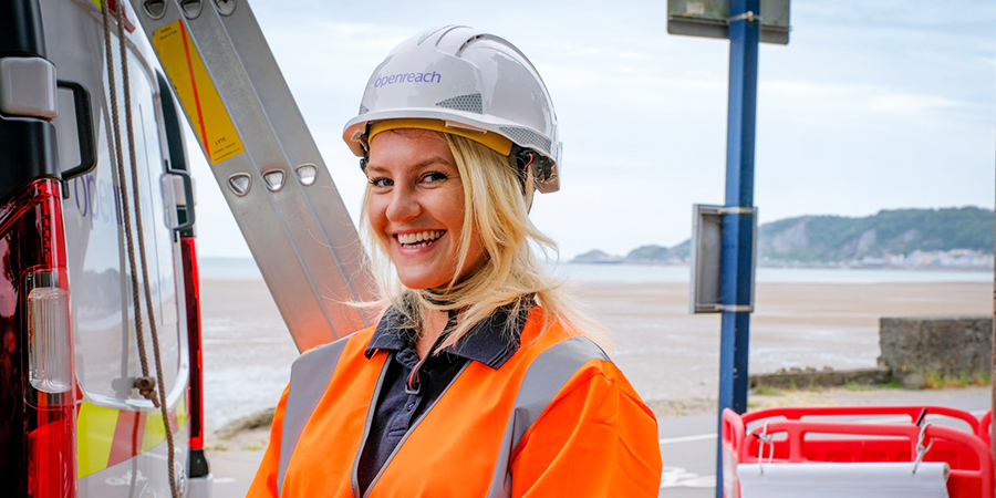 Ers cwblhau ei phrentisiaeth y llynedd, mae Tiffany bellach yn gweithio’n amser llawn fel peiriannydd telegyfathrebu Openreach, ac yn rhoi’r sgiliau a ddysgodd yn ystod ei phrentisiaeth ar waith.