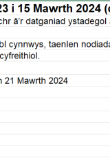 - Yr wythnos diweddaraf yw 11 i 15 Mawrth, a’r wythnos flaenorol yw 4 i 8 Mawrth. Roedd ysgolion ar gau ar gyfer hanner tymor rhwng 12 a 16 o Chwefror.